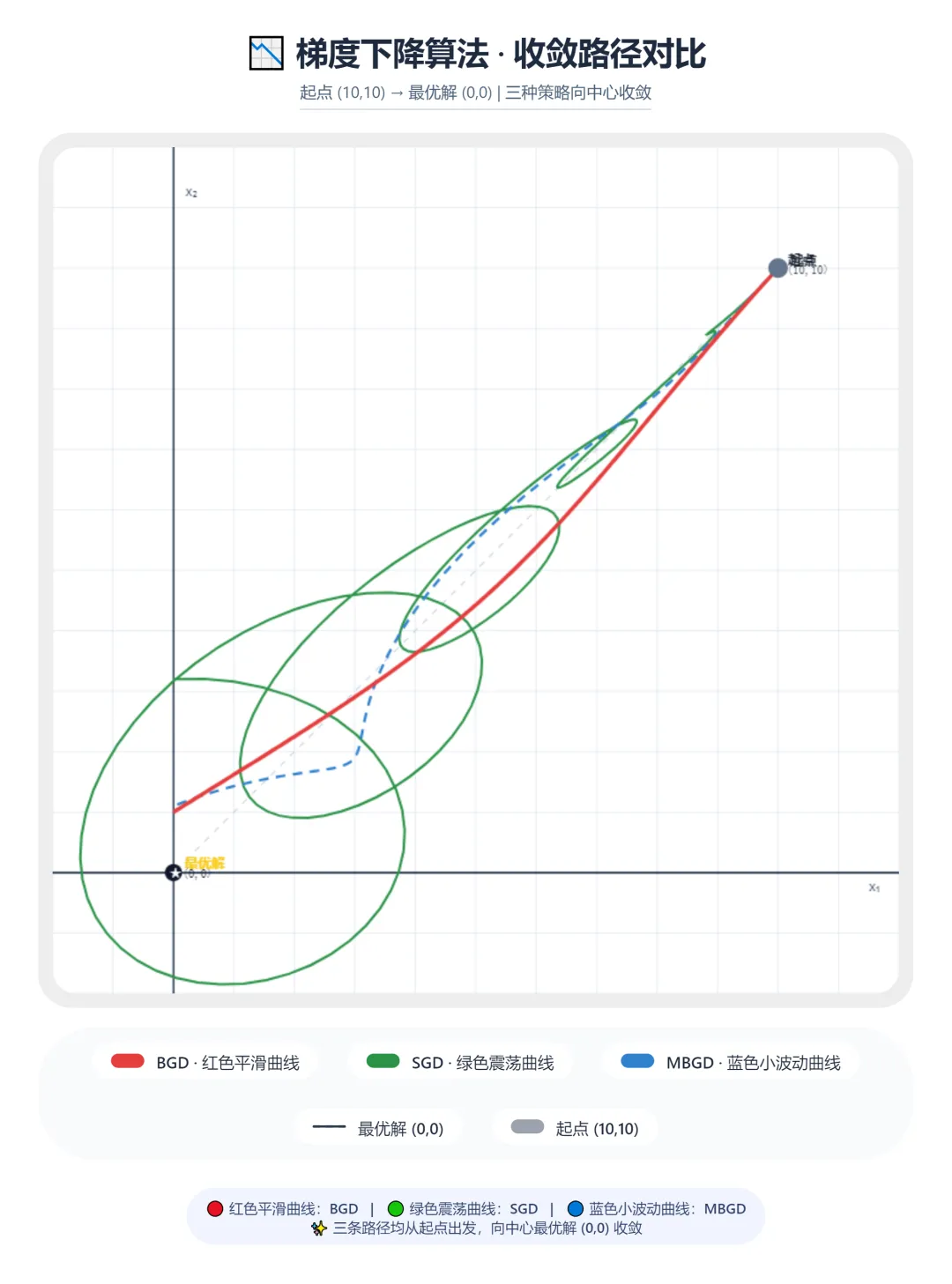 随机梯度下降(SGD):每一步迭代只选取一个样本计算梯度。优点是计算速度极快,适合海量数据;缺点是迭代路径容易震荡,可能在最优解附近来回波动,难以精准收敛。