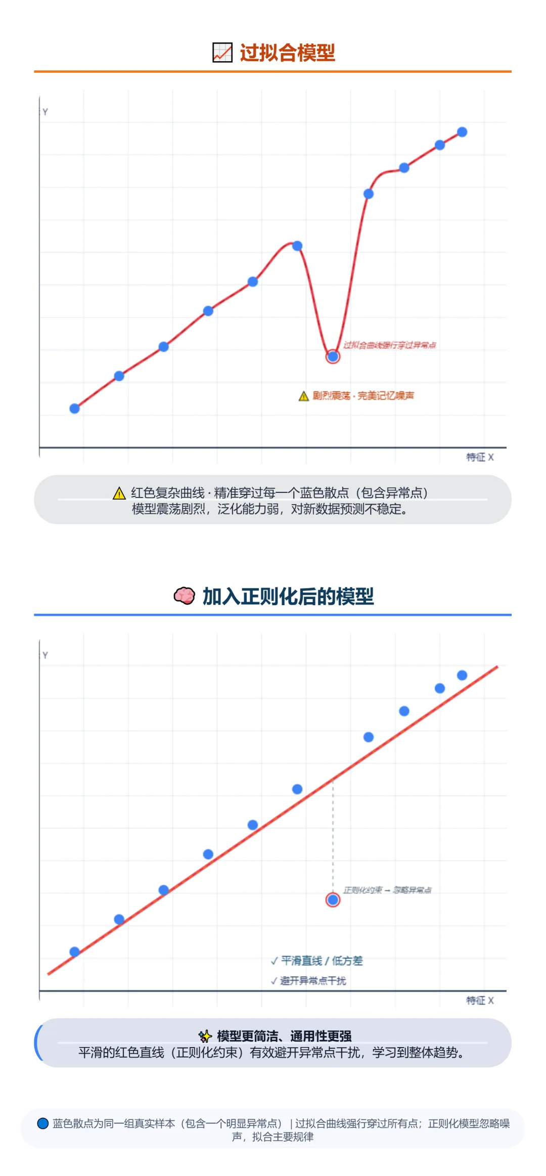而正则化就是解决过拟合的重要手段,它的核心思路是在损失函数中加入一个惩罚项,通过限制权重系数的大小,约束模型的复杂度,让模型更具通用性,避免过度拟合。