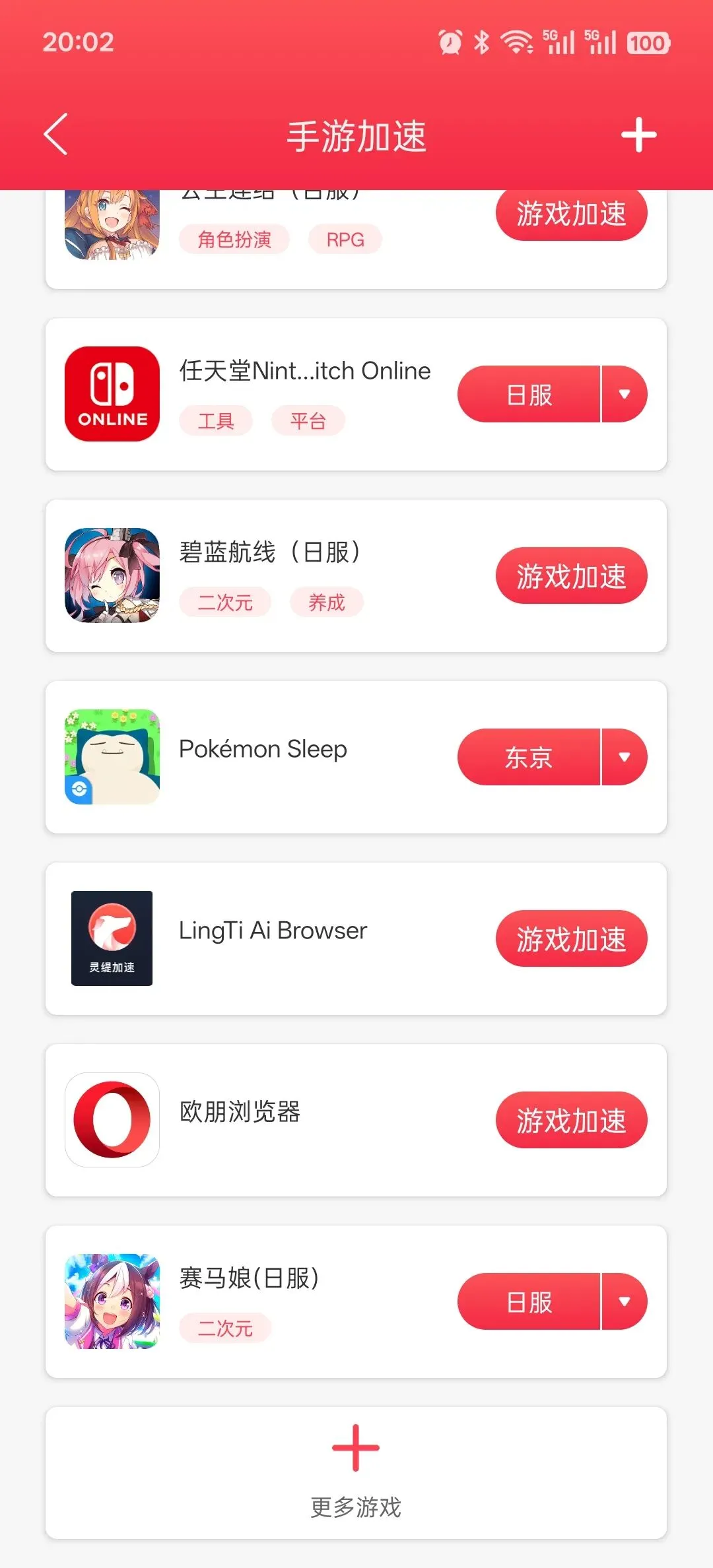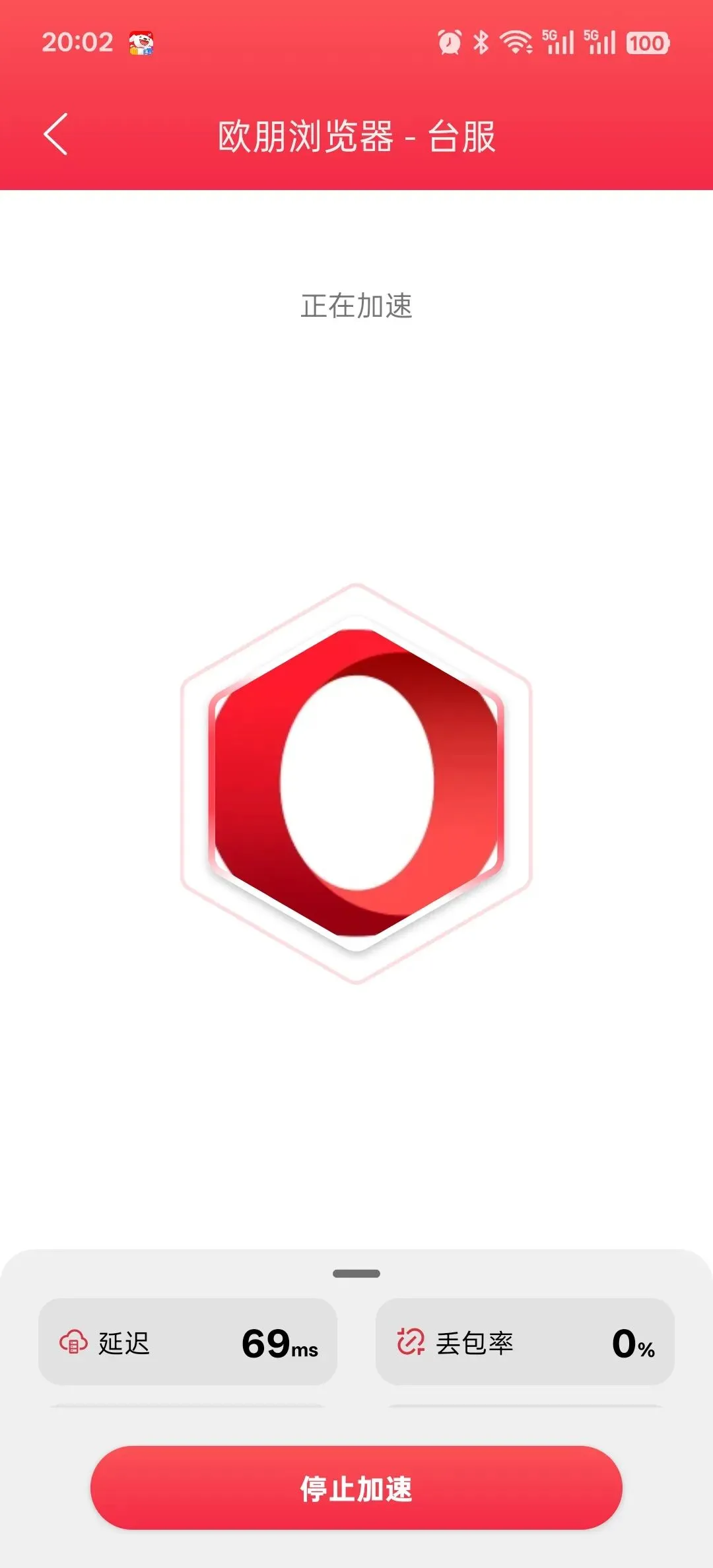 在列表中找到欧朋浏览器后,点击加速。加速成功后,页面会显示灵缇游戏加速器正在加速欧朋浏览器。