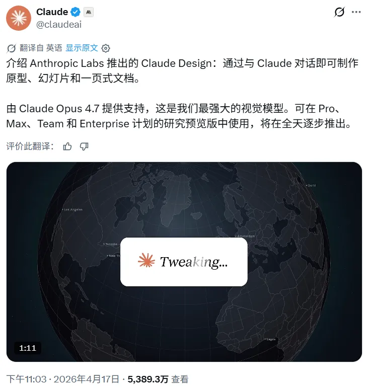 Anthropic 在 4 月 17 日推出了 Claude Design,