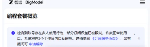 4月12日,他发现智谱coding plan套餐速率被限制,切换账号再次尝试后,却被提示“检测到账号存在多人使用行为,部分订阅权益已经被限制”,也就是“封号”。王先生向智谱申请解封,第二天又再次出现速率限制的问题。