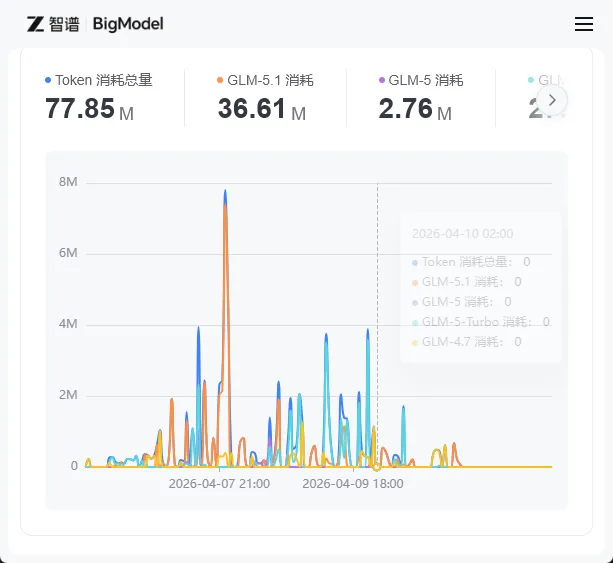 王先生提供的截图显示,截至4月12日,其套餐Token消耗总量为77.85M,最高的一天是4月7日,消耗Token还不到8M。对于限流原因,王先生认为是“超售”,也就是出售的算力超过了平台能承受的范围。
