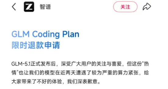 值得一提的是,智谱官方账号于4月13日发布“限时退款申请”,其中提到,“我们的模型在近两天遭遇了较为严重的算力紧张,给大家带来不好的体验,深表歉意”。