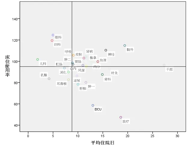 以全院平均住院日和床位使用率为目标值,建立各科室平均住院日-床位使用率组合图即四象限图,平均住院日低、床位使用率高的科室即位于第二象限的科室有: