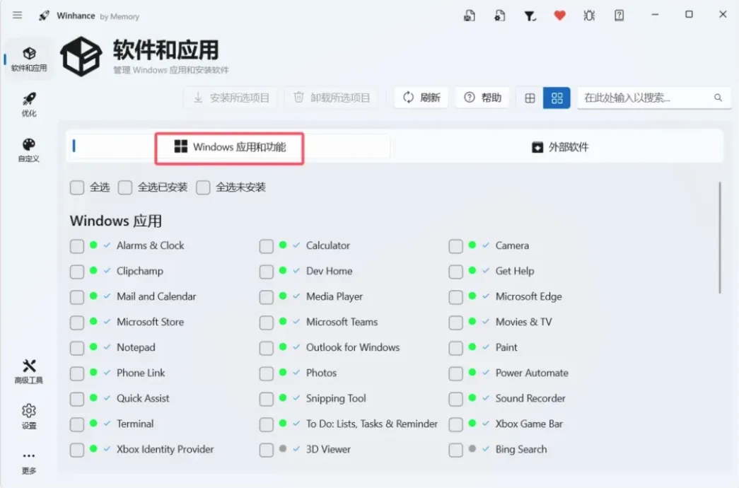 这是Winhance最硬核的地方。在“软件和应用”板块,它把Windows那些藏得很深的预装组件全给揪出来了。