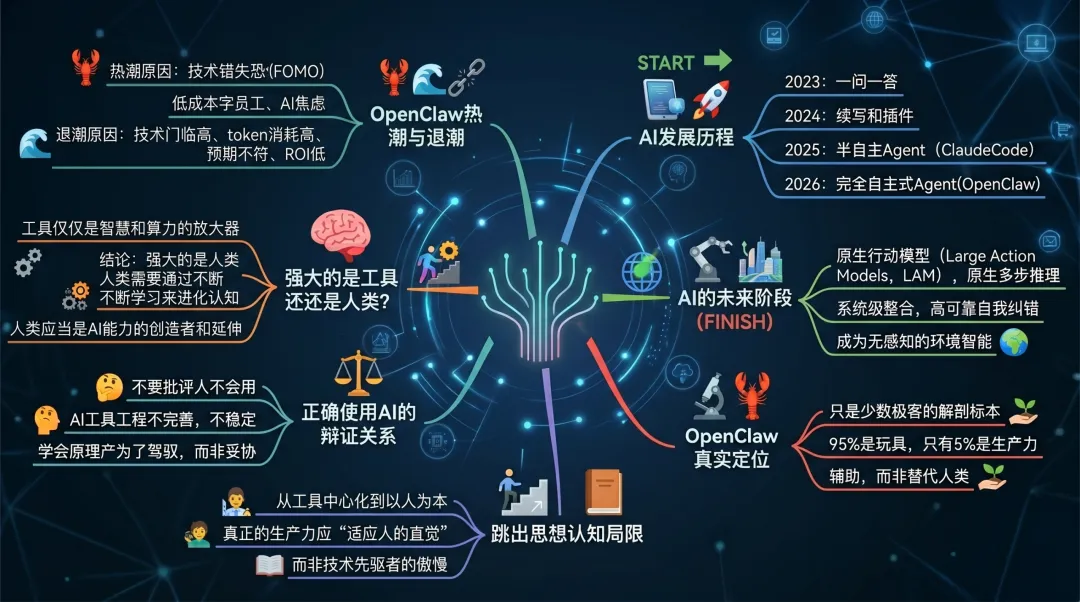 初级阶段(工具中心化):在技术刚诞生、尚未成熟时(如现在的OpenClaw),工具本身充满了毛刺。这时候,掌握工具确实需要极高的门槛。所谓“没发挥它的作用说明不会用”,本质上是技术先驱者对普通用户的傲慢。这时候,责任确实在工具——它不够成熟,不够鲁棒。