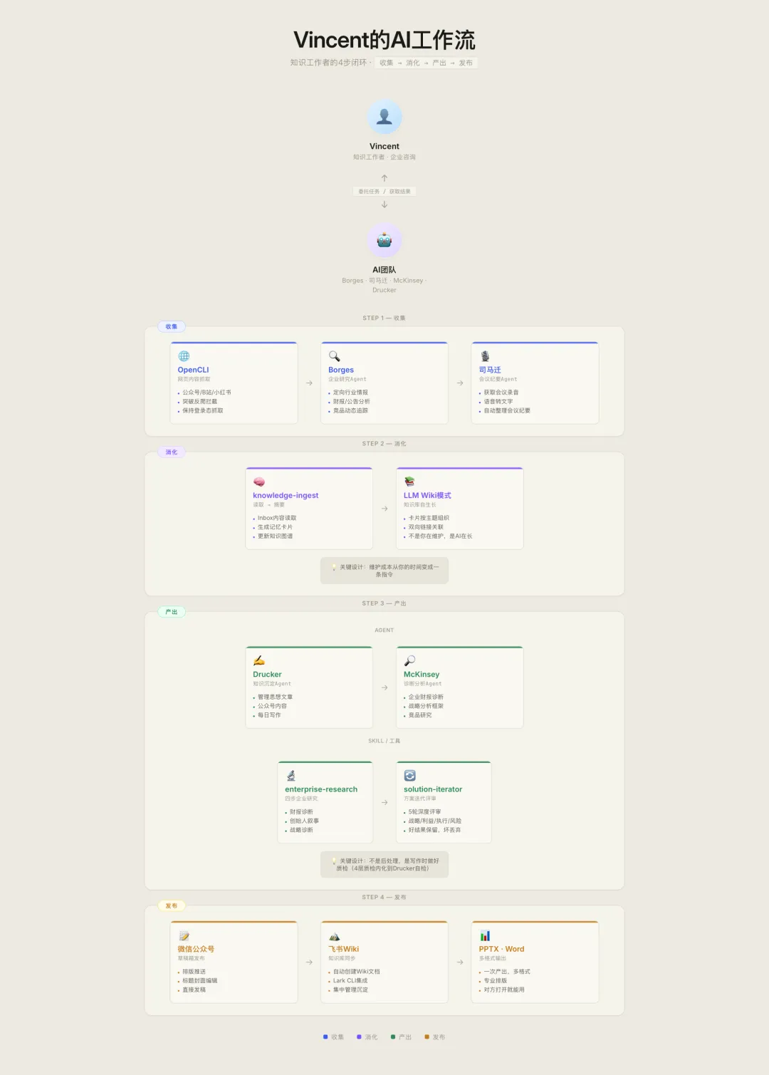 知识工作者的日常,表面上是"想问题、写东西",本质上是一个循环:收集→消化→产出→发布。听起来好像并不复杂,但真实情况却是:收集靠焦虑:看到什么都想存,微信收藏夹、笔记软件、电脑硬盘文件夹里的内容越来越多越来越乱,真正要找的时候一个都找不到。消化靠拖延:存下来的东西躺在微信收藏夹、笔记软件、电脑盘里吃灰,总觉得"以后再看"等于"永远不会看"。产出靠挤压:等到真要写报告、写文章了,才发现看过的不见得记得,记得的不见得理解,理解的不见得能够很快写出来。虽然有了AI,但是写出来的东西要么没有人味,要么根本不像自己写的。发布靠手工:写完了还要手动转格式、制作PPT、画框架图,不停地修改迭代。这不是工作效率问题,这是工作流设计问题。一个人在这四个环节里来回救火,每个环节都没有形成积累,每次都是从零开始。你不是在工作,你是在重复消耗自己。我的AI工作流:4步闭环