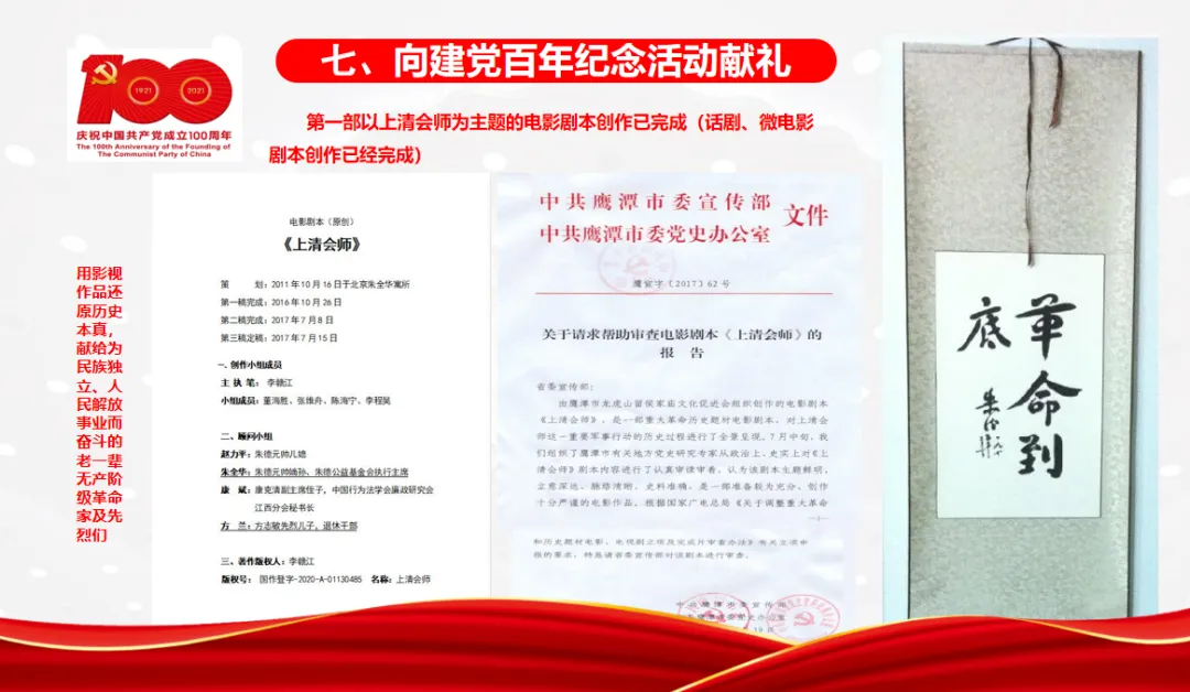 1.牵头撰写《关于抢救性保护濒危的重大红色文物“上清会师”旧址的报告》等公开信与研究报告,推动遗址保护立项。