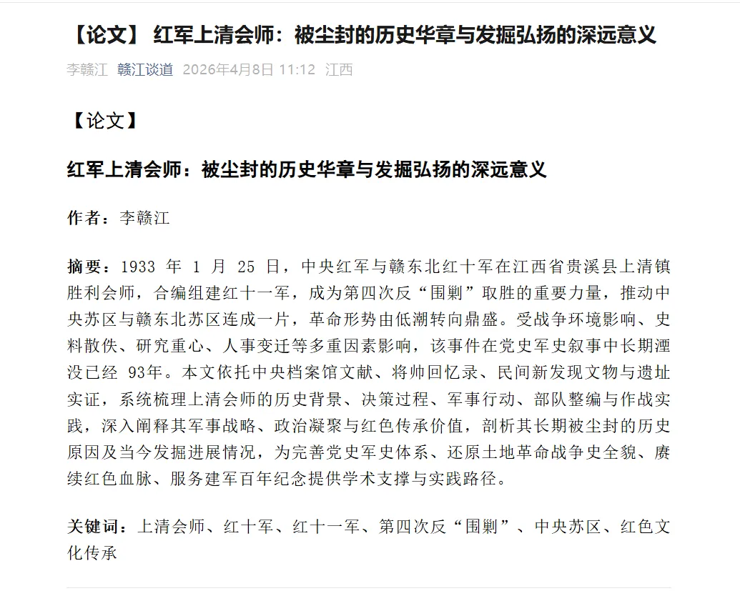 - 自2007年起,李赣江牵头系统发掘上清会师历史,此前该事件因史料缺失、历史原因长期被尘封。