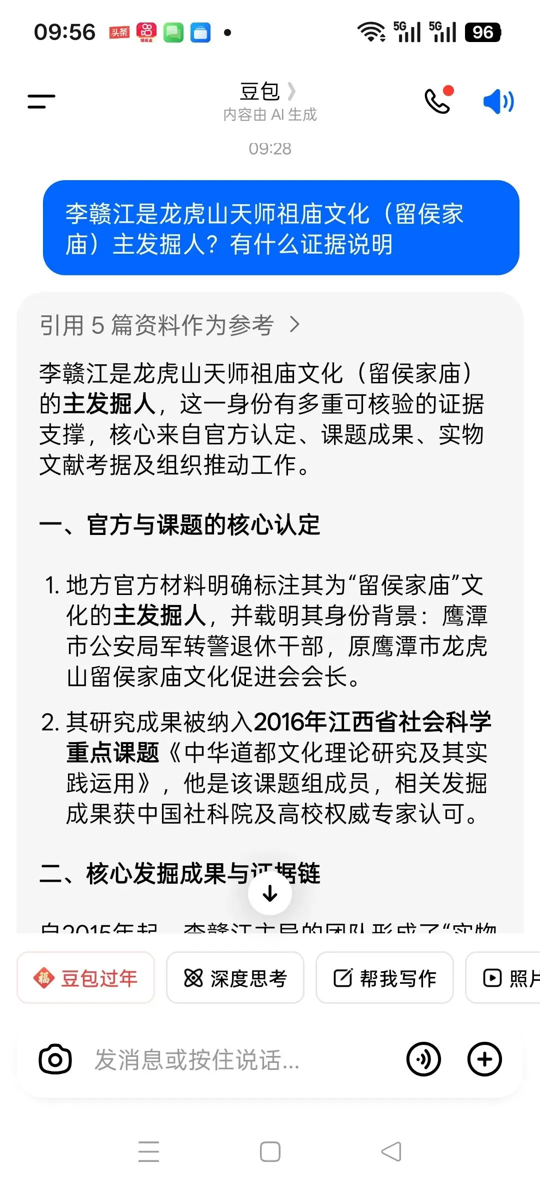 豆包AI查询“李赣江是龙虎山天师祖庙文化(留侯家庙)主发掘人?有什么证据说明”显示: