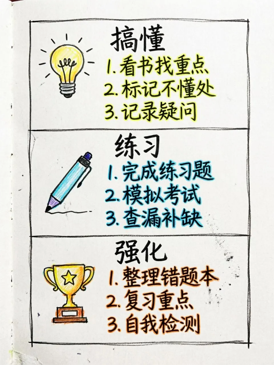 想象给12岁小孩讲。他能用自己的话复述,你才算真懂。讲不清?你自己也没透。知道"是什么"不够,得知道"能用在哪"。举不出来?知识是死的。学完不复习,一周后独立做。还记得,进长期记忆了。忘了?只是"当时懂了一下"。