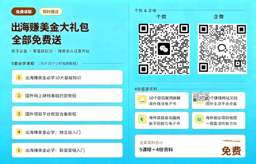 同时还给大家准备了一份出海大礼包,让你快速了解出海做项目的一些必备技能,以及避坑指南,让大家少走弯路。