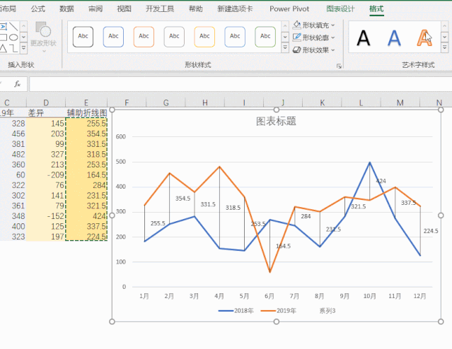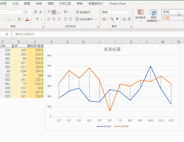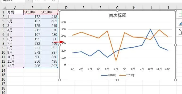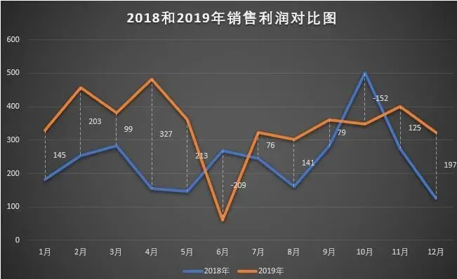 折线图在Excel中十分常用,如对比2018与2019年销售利润情况: