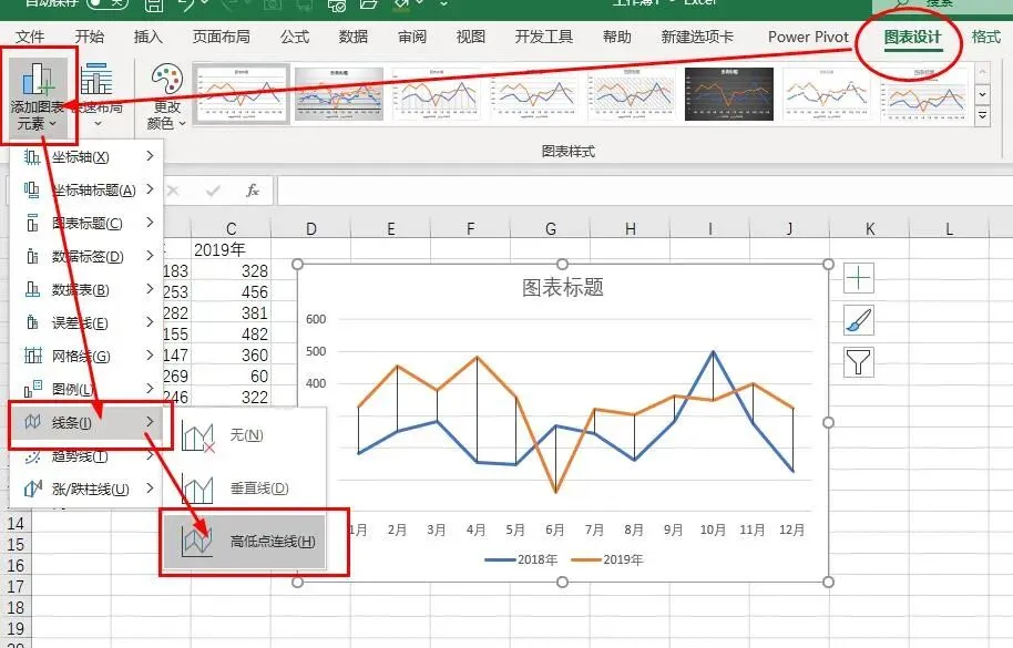 首先插入折线图 - 图表设计 - 添加图表元素 - 线条 - 高低点连线