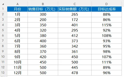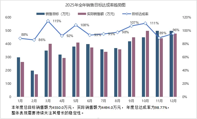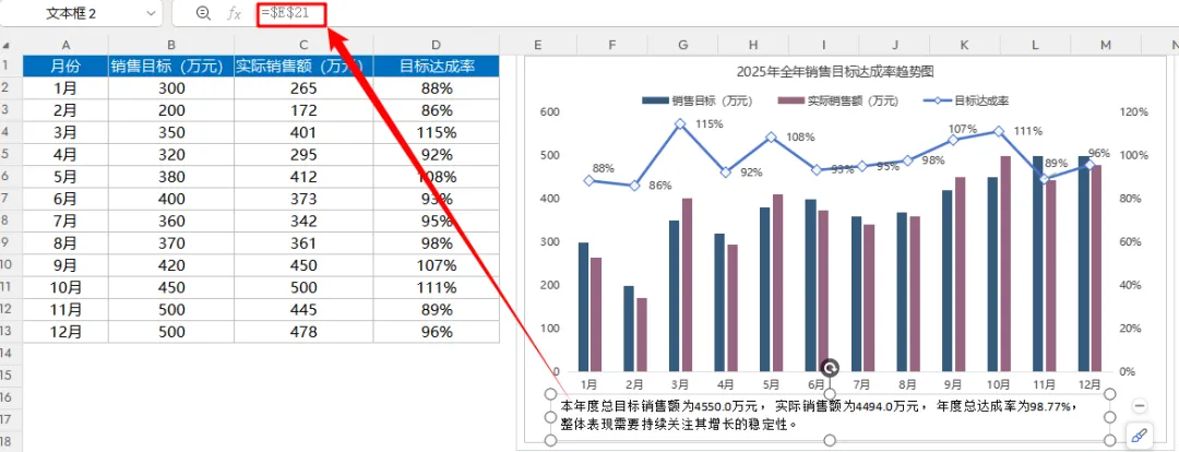 =LET(总目标,SUM(B2:B13),总实际,SUM(C2:C13),总达成率,总实际/总目标,TEXTJOIN(" ",1,"本年度总目标销售额为"&TEXT(总目标*10000,"0!.0,万元,"),"实际销售额为"&TEXT(总实际*10000,"0!.0,万元,"),"年度总达成率为"&TEXT(总达成率,"0.00%")&",",IF(总达成率>1,"整体表现超出预期,","整体表现需要持续关注其增长的稳定性。")))