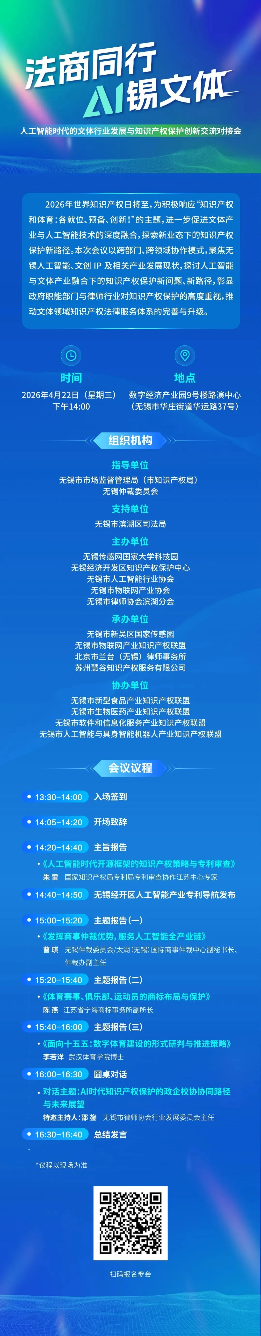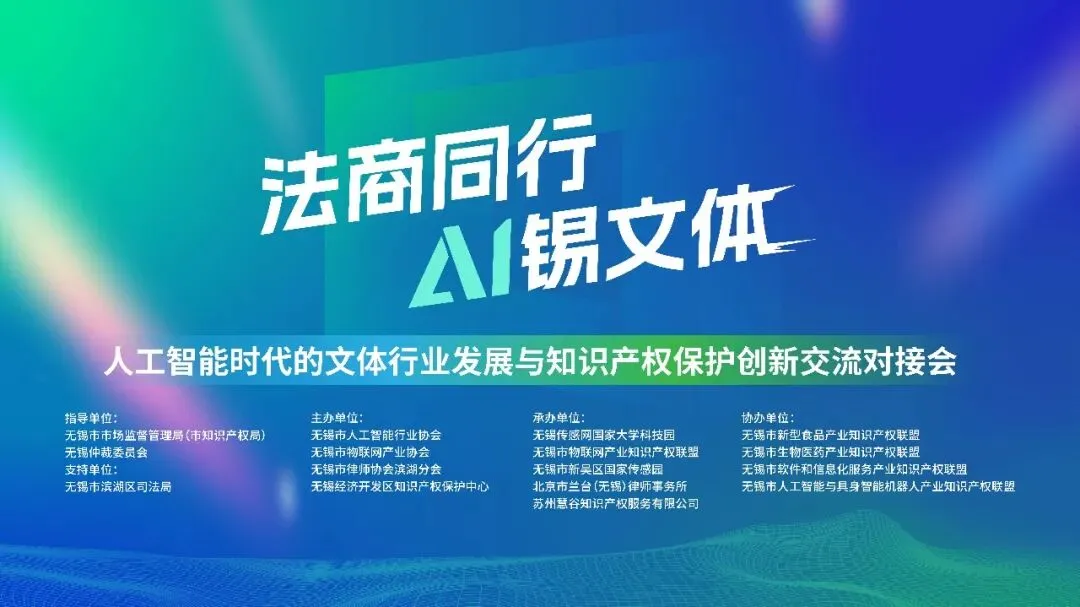 为响应世界知识产权日号召,推动体育创新、赋能体育产业发展,特别策划“法商同行·AI锡文体”人工智能时代的文体行业发展与知识产权保护创新交流对接会,本次活动由无锡市人工智能行业协会、无锡市物联网产业协会、无锡市律师协会滨湖分会、无锡经济开发区知识产权保护中心主办,无锡传感网国家大学科技园、无锡市物联网产业知识产权联盟、无锡市新吴区国家传感园、北京市兰台(无锡)律师事务所、苏州慧谷知识产权服务有限公司共同承办,感谢无锡市市场监督管理局(市知识产权局)、无锡仲裁委员会的指导,感谢无锡市滨湖区司法局及相关协办单位的大力支持。