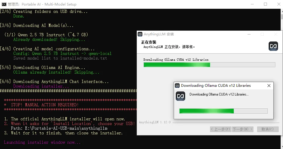 安装窗口会显示HuggingFace(我已改成国内镜像地址)的下载链接 复制链接,用其他工具下载.gguf文件 将文件放入U盘models/文件夹 重新运行install.bat,会自动跳过已存在的文件