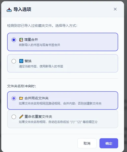 Q: 会直接改我浏览器里的收藏夹吗?不会。所有操作都在软件里进行,只有你手动导出并导入浏览器才会生效。