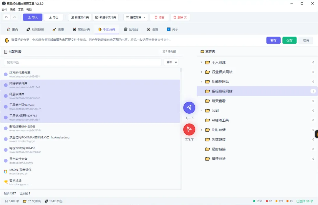 还可以手动分类个性飞一下、不飞了功能,将所有书签逐个、批量分配到对应的文件夹内,还支持暂存。