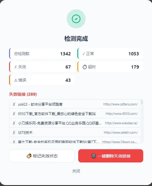 ✅ 绿色 = 正常可用 ❌ 红色 = 已失效(404等) ⏱ 黄色 = 超时 ⚠ 灰色 = 检测出错