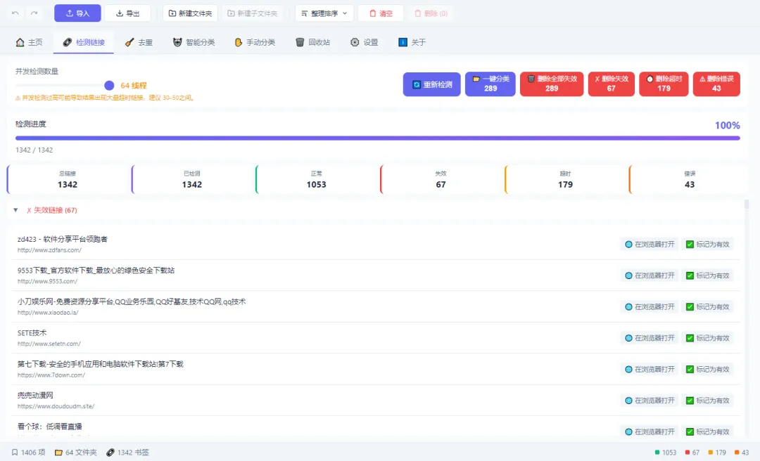 选中失效的,一键删除,清爽!或者一键将失效链接挪到各自对应的文件夹去