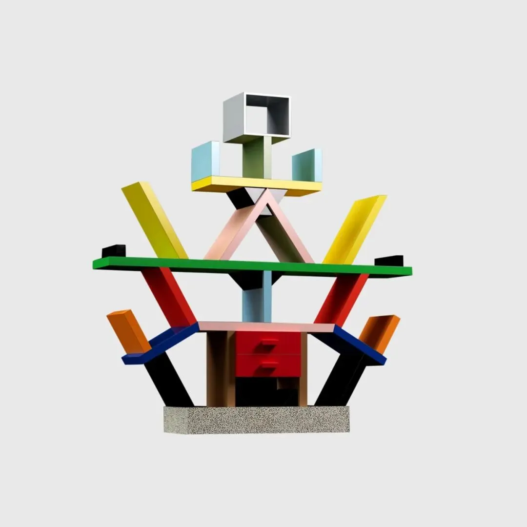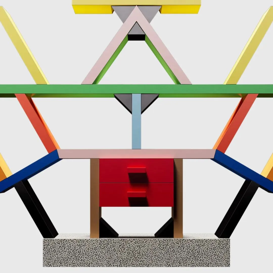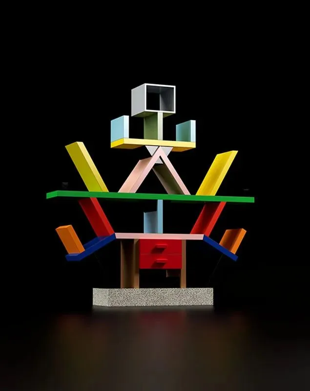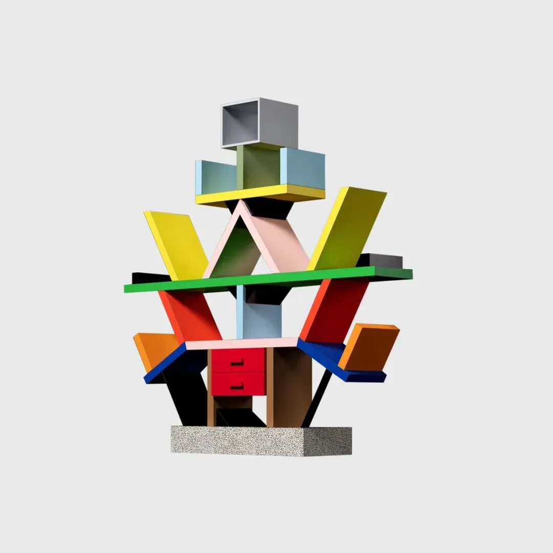 Carlton Room Divider 是孟菲斯设计里很典型的反常识作品。这款书架颜色很跳、结构很乱,看起来像拼起来的一样,用起来也不是特别方便。