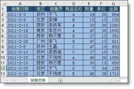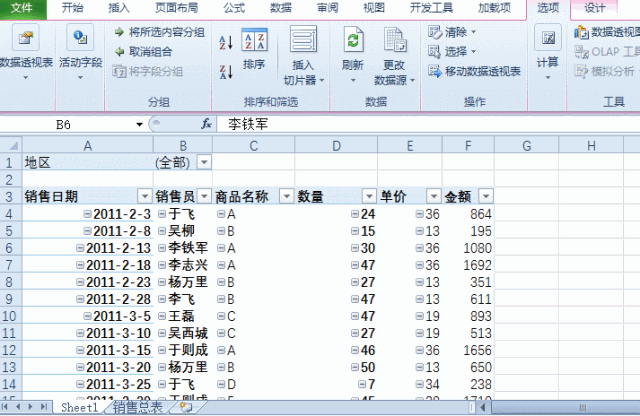 以下是各地区的销售总表,要求按照地区来拆分为多个工作表,并保存。