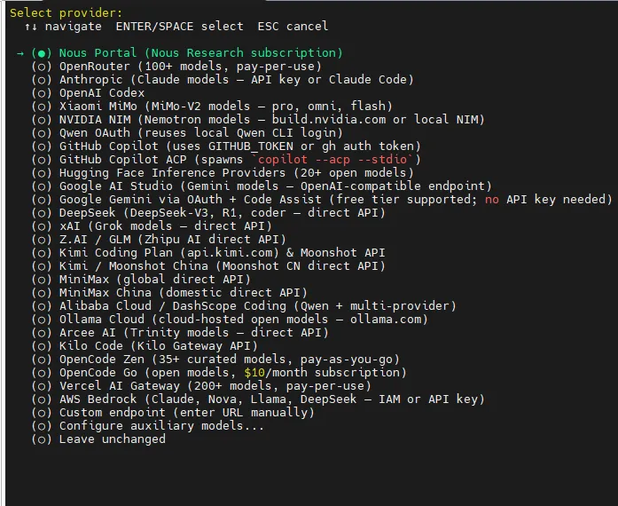 hermes model # 选择大模型提供商hermes setup # 交互式向导