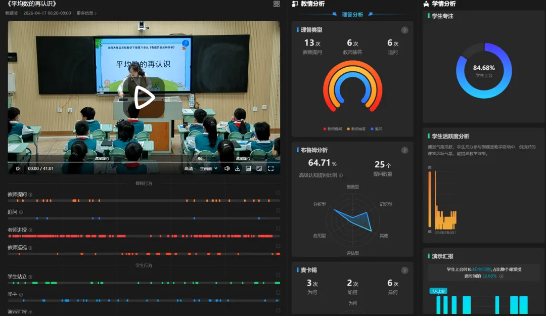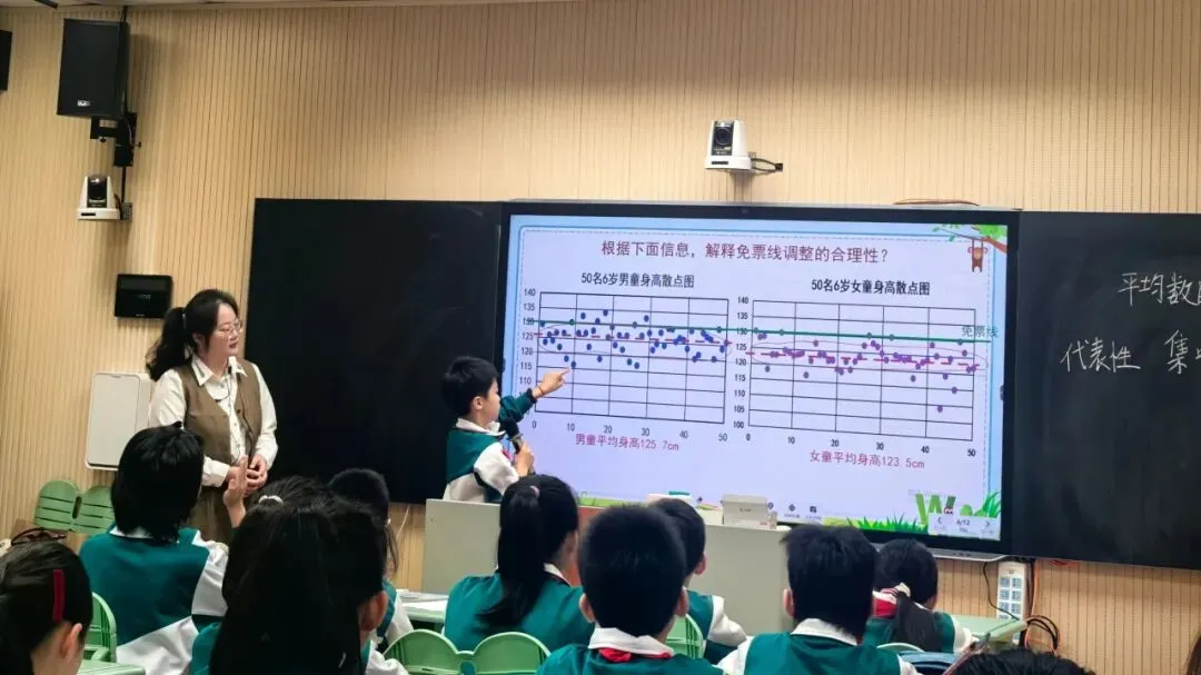 本次教研活动由程颖莹老师执教研讨课,授课内容为北师大版数学五年级下册《平均数的再认识》。课堂紧扣六力成长课堂育人导向,以“代表性”为核心主线,依托真实生活情境与统计图表,借力AI技术精准赋能,引导学生在数据分析中自主探究、合作说理、实践应用,让学生在真实问题中理解平均数本质、体会数据价值,发展数据意识与应用意识。