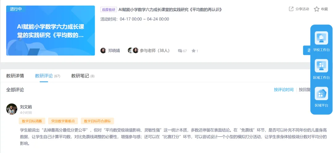 为拓宽教研覆盖面,我校依托“泉教育”平台,创新运用“云端共研”模式,组织全体教师登录平台开展线上评课、同步记录教研笔记,有效打破时空壁垒,确保每位教师都能围绕六力成长课堂深度参与、充分交流,扎实沉淀育人智慧。