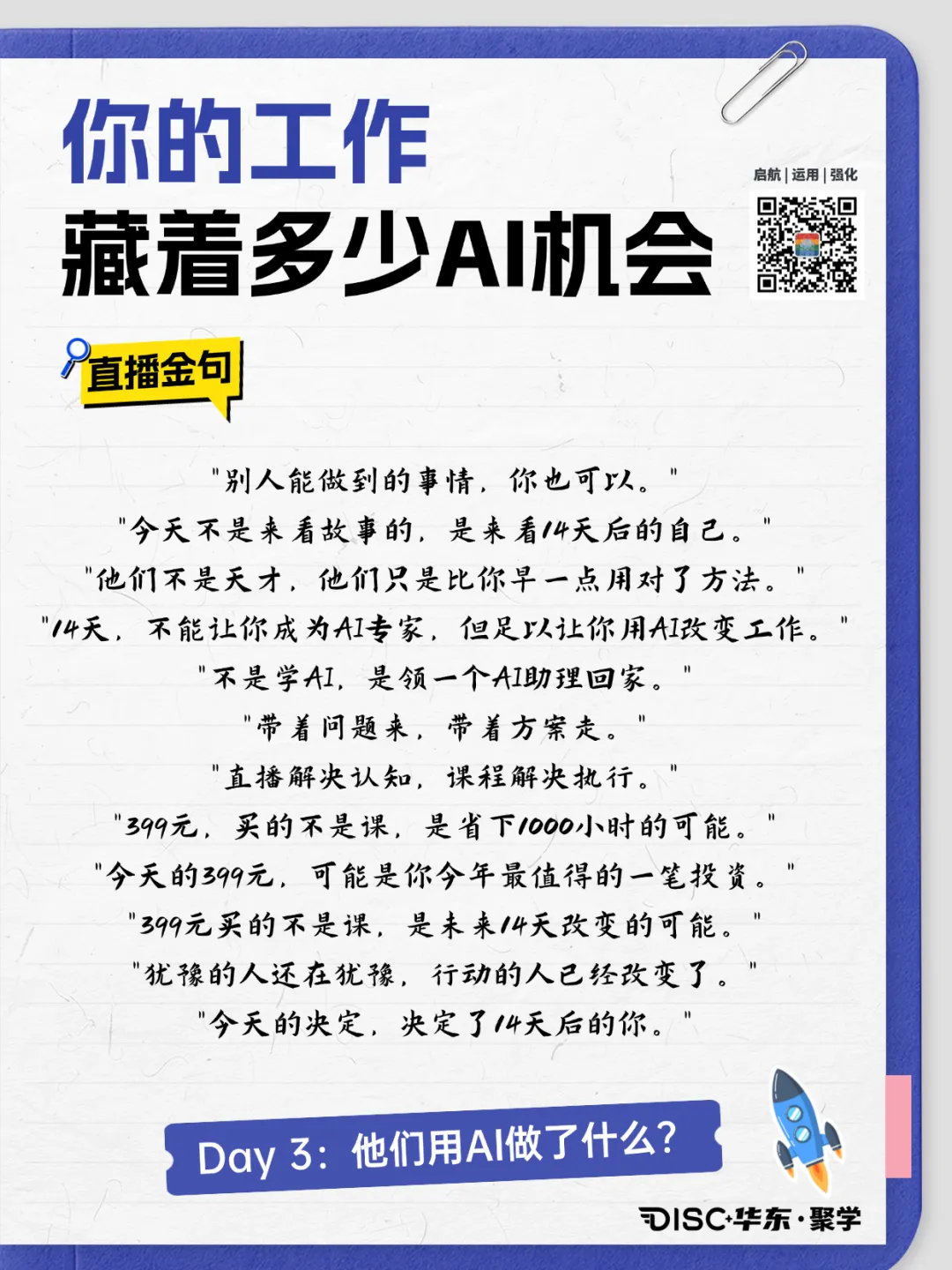 别人教你工具,我教你的是你的活怎么用工具解决。AI代替不了你的亲情与陪伴,它只会帮你把重复活都干完,让你有时间去做更重要的事。