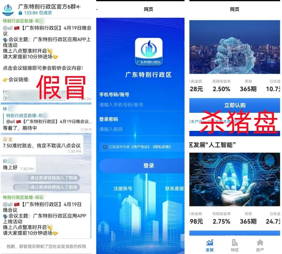 近期网络中出现了假冒的“广东特别行政区”APP,该项目宣传是“国家项目”,免费给参与者发房子,这些都是骗钱的噱头,APP中上线了杀猪盘,充值收款要找所谓的“客服”(实际是骗子),明显就是诈骗洗钱的杀猪盘..........