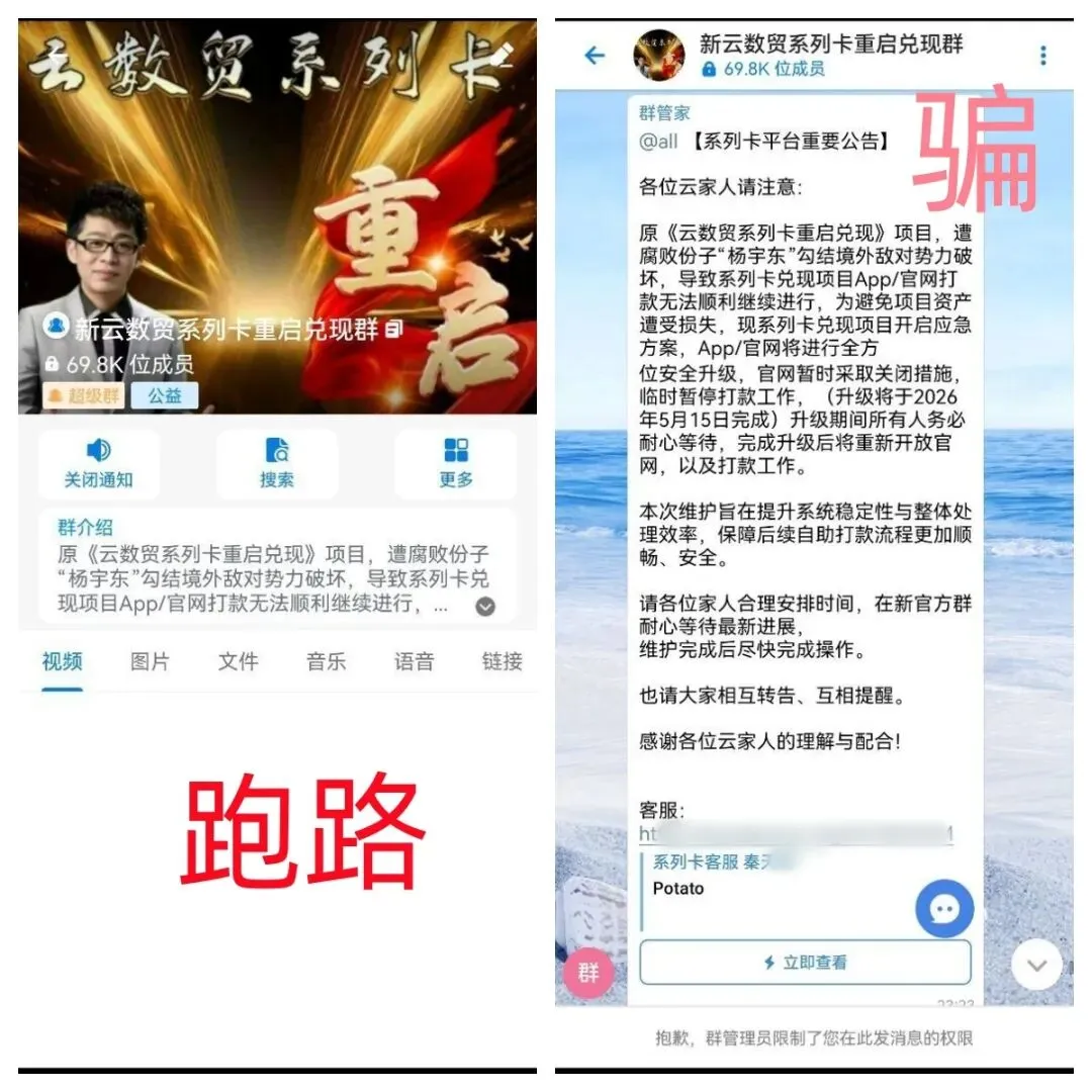 骗了不少钱的云数贸系列卡APP终于“升级”了,群里面刷屏发了消息,要“升级”到5月15日,一个APP哪有这么长时间的“升级”?这么长的时间,做新的APP都要做出很多个来!意味着该项目卷款跑路。