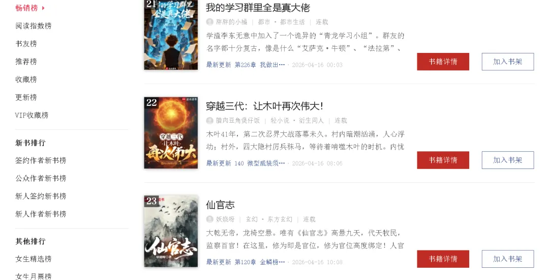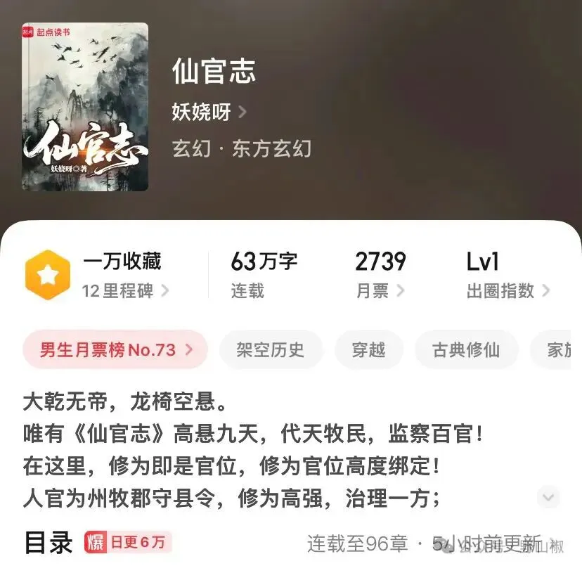 《仙官志》是作者妖娆呀所写的于起点发布的东方玄幻题材类作品。2026年4月1日上架即爆更22万字,此后更新速度稳定保持在日更4-6万字,远远超出同类作者的平均水准,码字水平恐怖如斯。截至4月16日,本书已更新108万字,闯入起点畅销榜前30。极快的更新频率加之读者爆料文中多段表述AI文风明显,引发了广大作者与读者的不满情绪与争议。