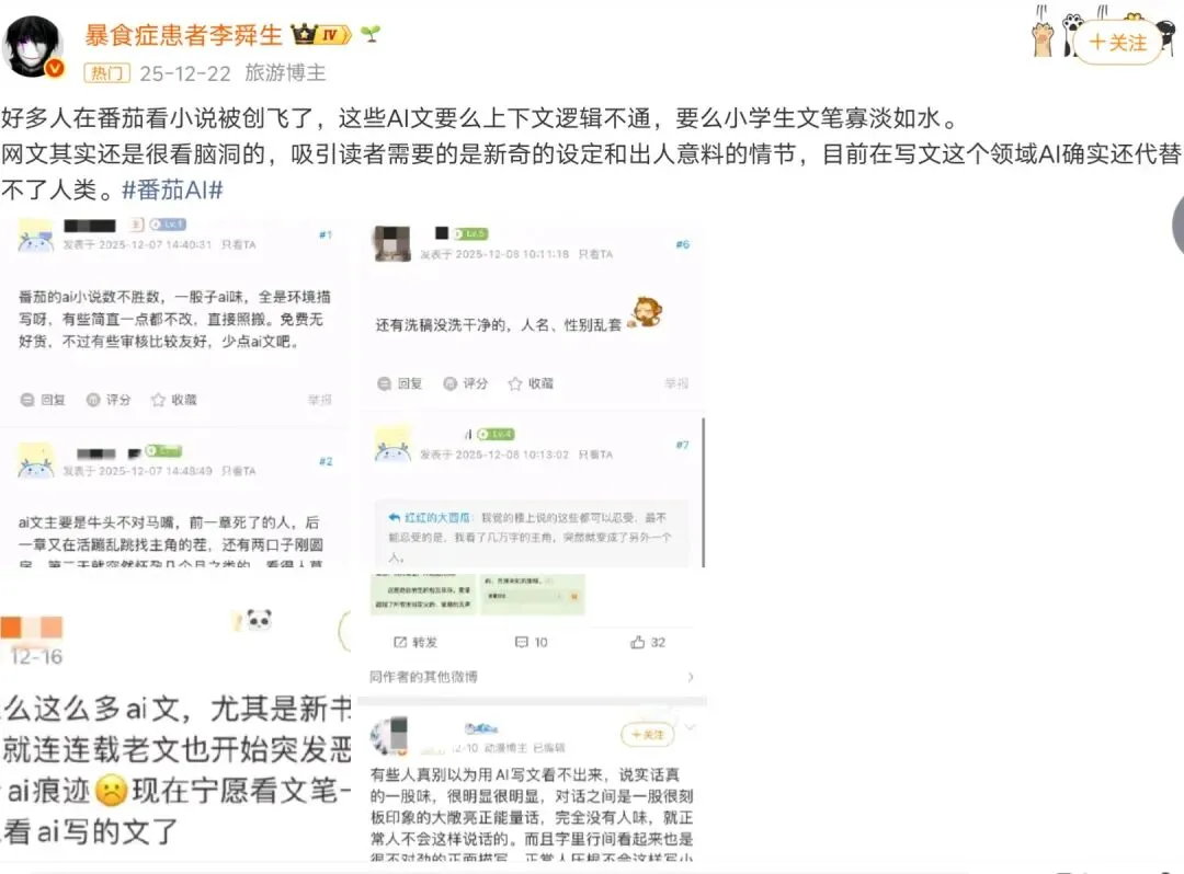 AI 生成的小说、图书,被读者形象地称为 “文学预制菜”—— 看似有完整的故事框架、剧情流程,实则毫无灵魂、毫无营养。为了追求更新速度与流量爽点,AI 文普遍存在剧情套路化、人物扁平化、情感空洞化、逻辑碎片化等问题,通篇都是流水线式的模板内容,没有人物成长、没有情感共鸣、没有思想表达,读完即忘。大量读者吐槽:“看 AI 文就像吃没有味道的快餐,全程感受不到作者的用心,越看越觉得乏味,纯纯浪费阅读时间。”