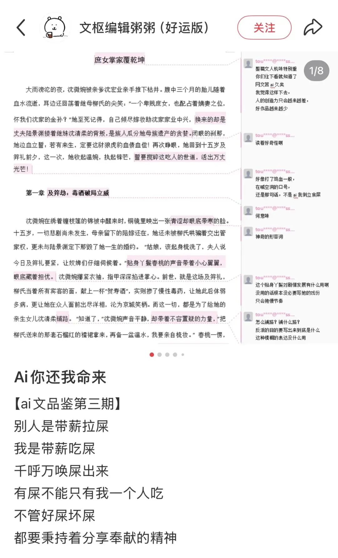 读者普遍认为,AI 创作乱象愈演愈烈,与平台监管缺失、规则模糊有着密不可分的关系。大量读者呼吁,应尽快出台明确、细化的 AI 创作管理规范,建立强制披露机制,要求作者在作品首页明确标注 AI 参与创作的程度;同时加大技术 + 人工双重审核力度,严惩批量生产低质 AI 文的工作室与作者,整治控评、删评等违规操作,保障读者的知情权与监督权,守护健康、公平的创作与阅读环境。