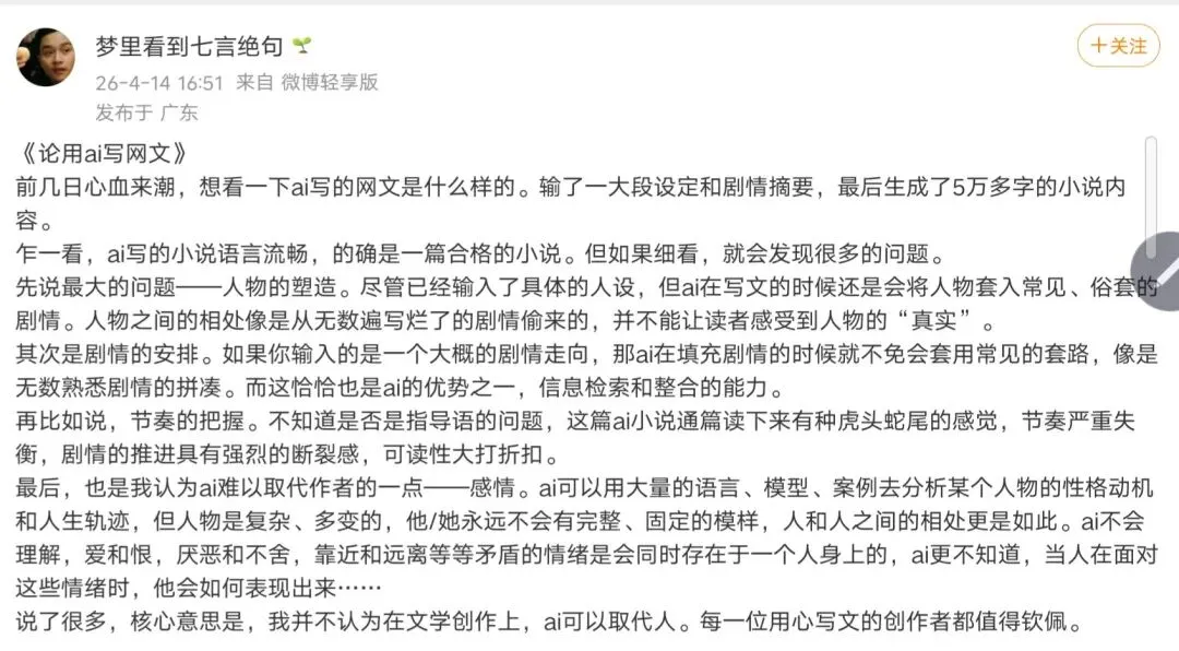 一位成熟的网文作者,即便全力以赴,日更字数极限也仅在 1-2 万字,且需要花费大量时间打磨剧情、塑造人物、梳理逻辑、打磨文笔……而 AI 工具却能轻松实现日更数万字,甚至几十万字,零成本批量产出内容,凭借超高更新量抢占平台流量推荐与读者精力。不少原创作者感慨创作不易,大量读者也纷纷发声力挺,直言 AI 水文的不公平竞争,正在让认真创作的作者无路可走。