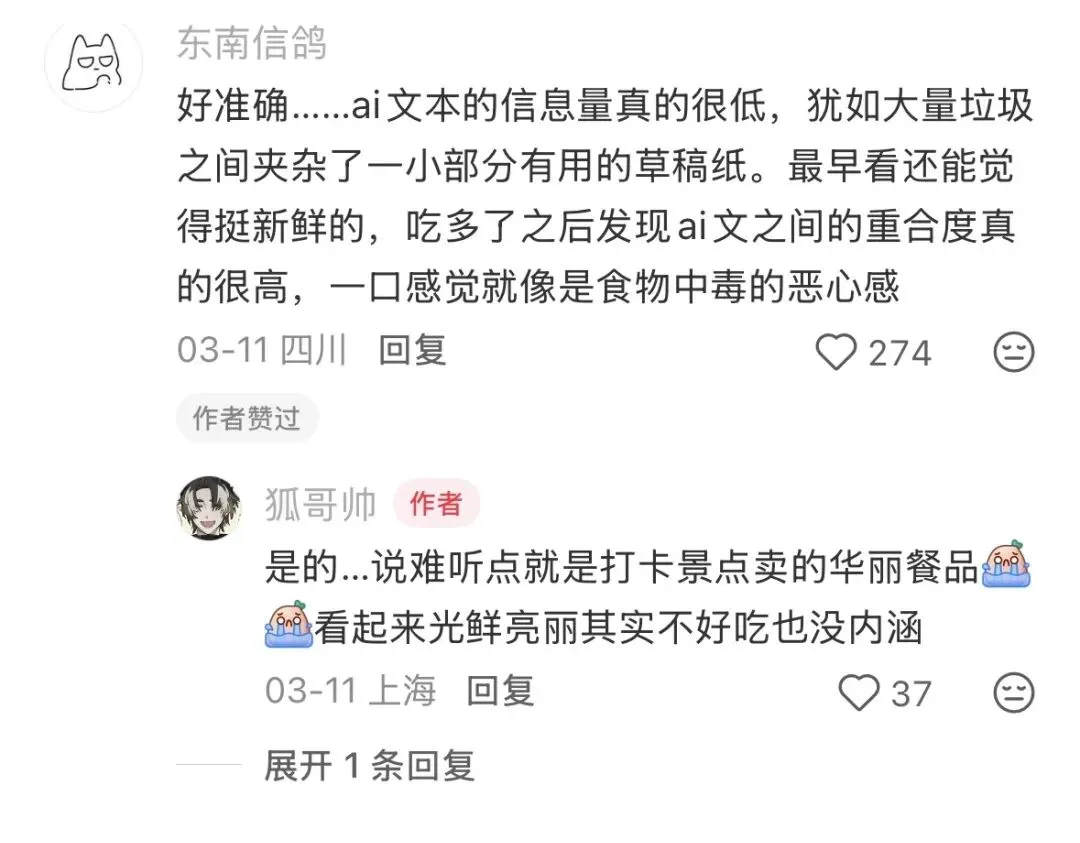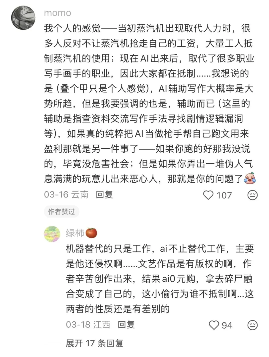 通过对众多读者评论的梳理能够发现,读者对 AI 写作的态度并非一刀切,他们不反对作者使用 AI 进行素材整理、大纲梳理、错别字校对、文笔润色等基础辅助工作,这确实能够帮助作者提高创作效率,减少重复性工作,但使用 AI 生成核心剧情、全文代笔且隐瞒创作事实的行为,是读者坚决不能接受的,认为这是对原创底线的挑衅,也是对读者的失责。