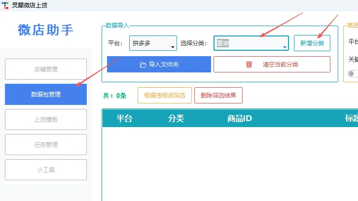 2,新增分类(方便分类上传,管理),上传完成导入商品数据包