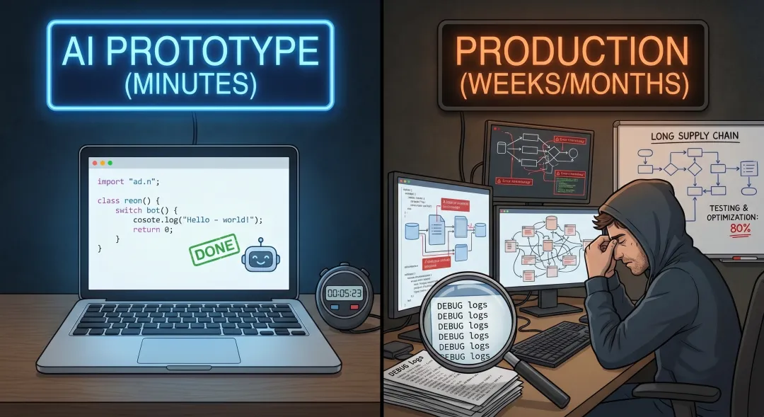 基于AI开发做简单的程序分分钟,但是真正做到生产级的就会遇到大量的debug时间,如果上下游链路很长,其实AI这方面做的并不好,往往80%的时间在测试优化中~~~