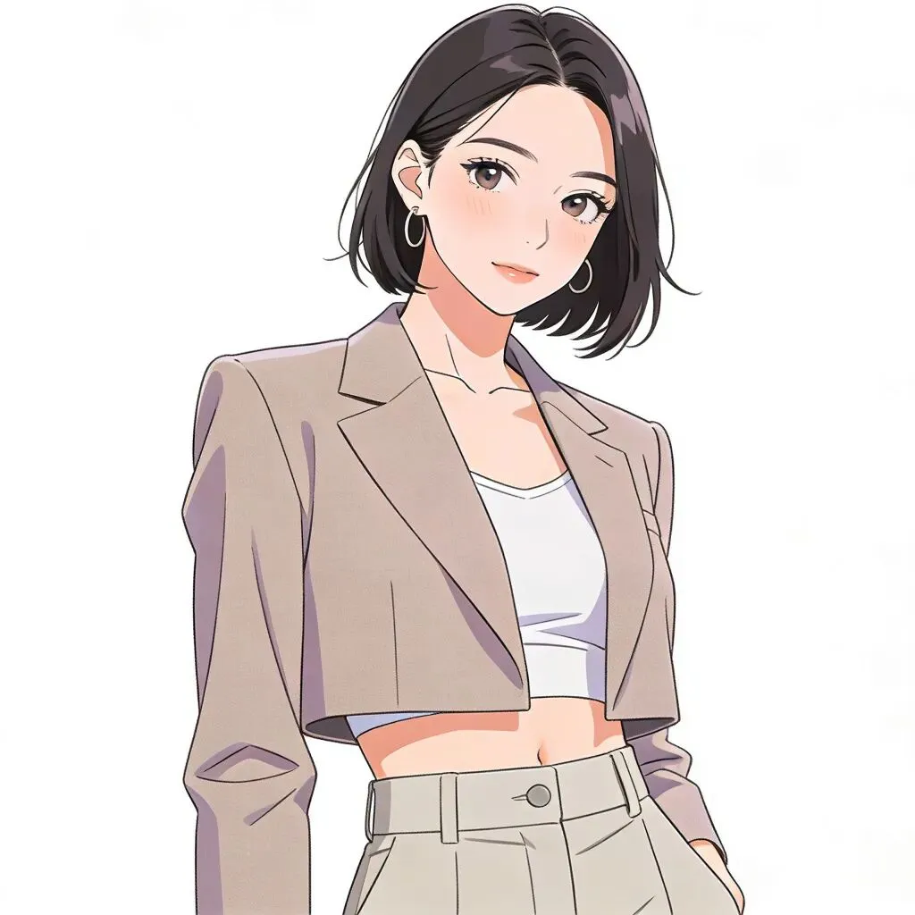 短款的小西装,刚好卡在腰线的位置,不会像普通的长西装那样压身高,然后搭配同色的高腰西装裤,把腰线露出来,整个身体的线条就拉长了,而且这套衣服看起来特别利落,很适合上班穿,不会太休闲,也不会太正式。