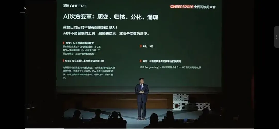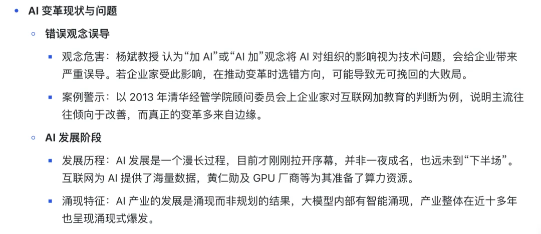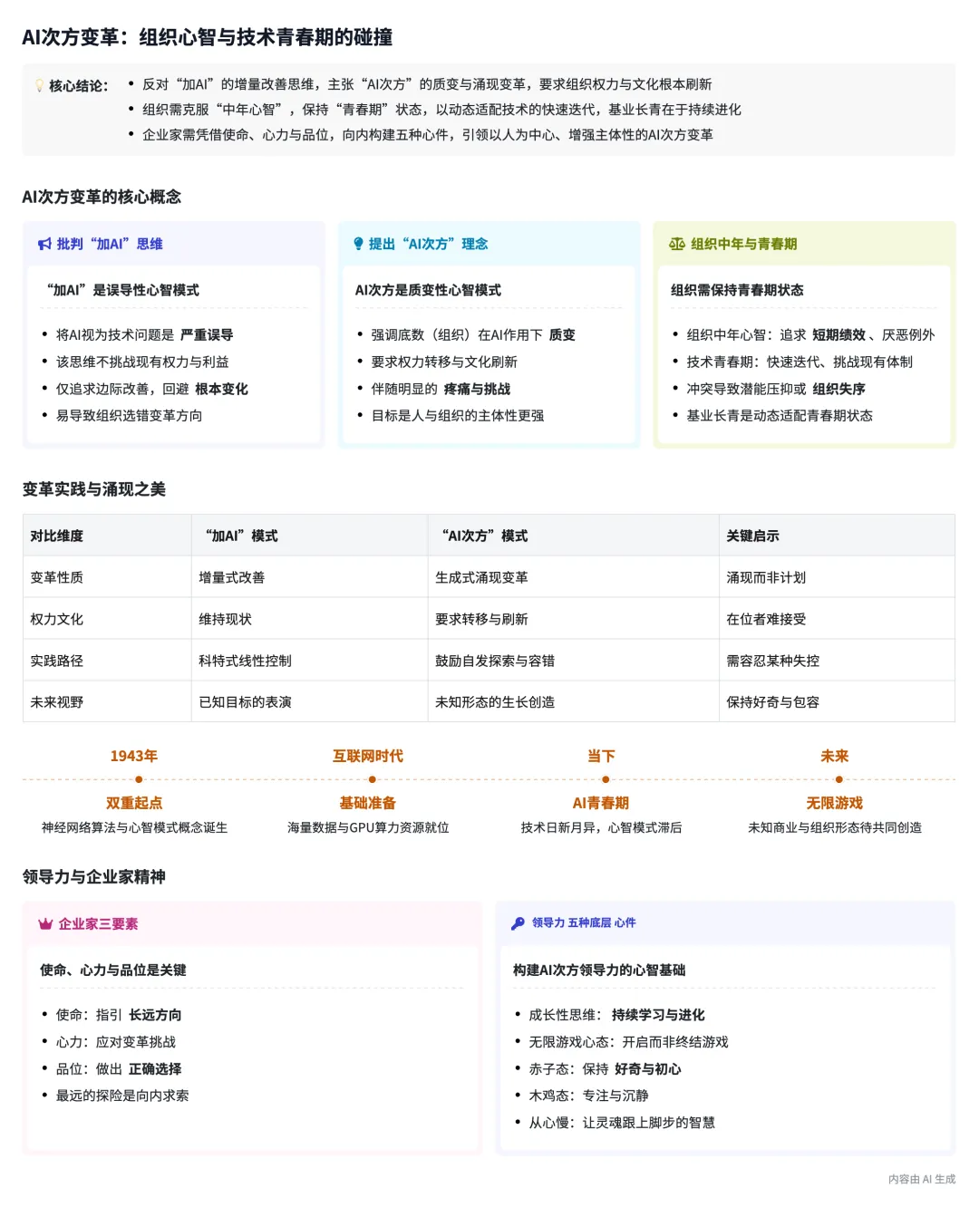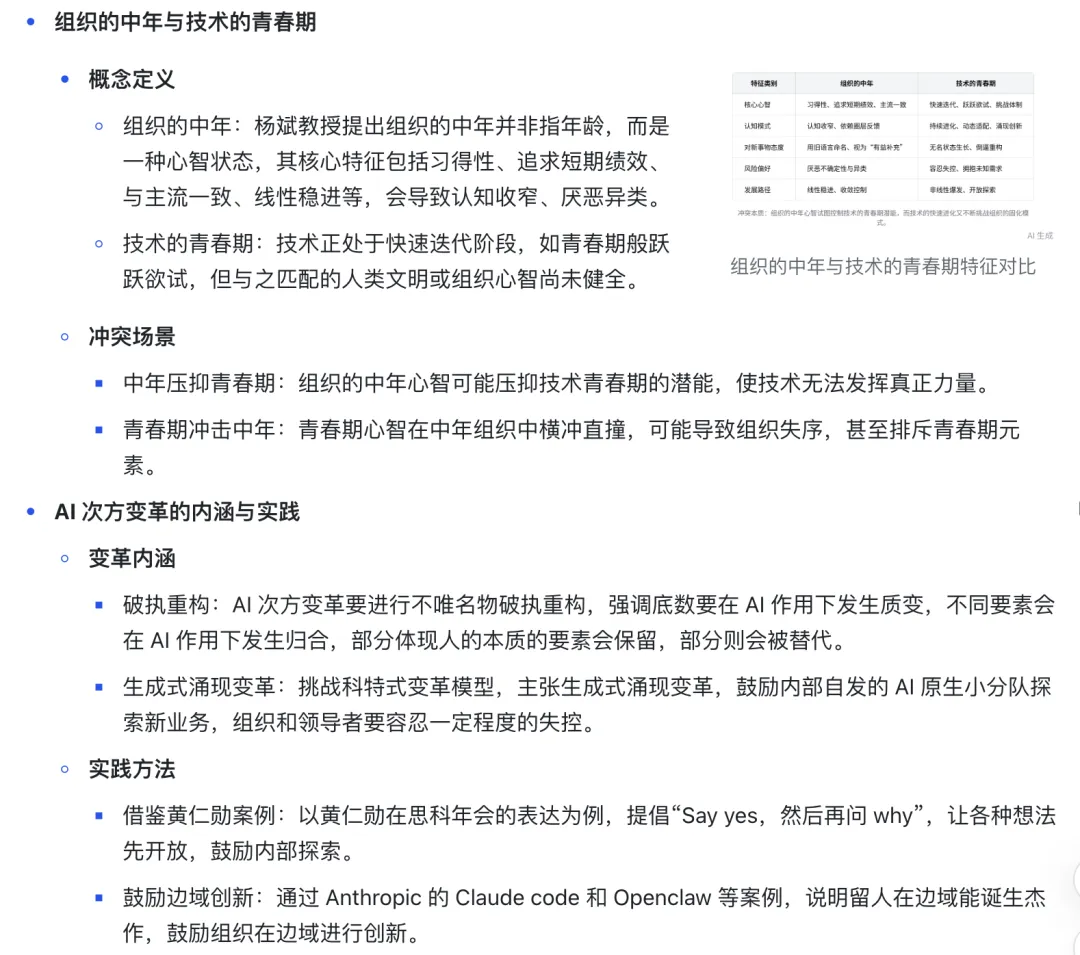 杨斌教授围绕 AI 次方变革展开分享,指出当前“加 AI”观念的误导,分析组织中年与技术青春期的冲突,阐述 AI 次方变革的内涵、实践方法及企业家应具备的要素,内容如下: