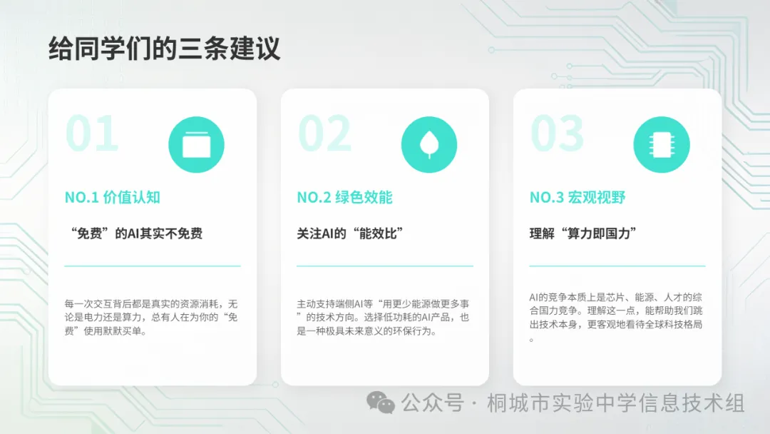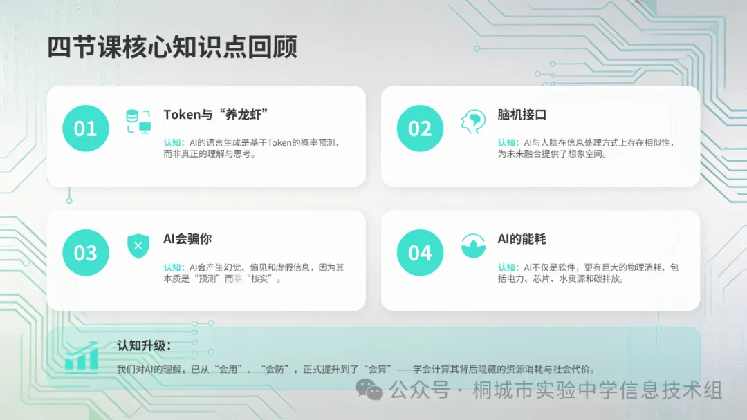 四节课下来,你们对AI的认知又升了一级:不只是"会用",也不只是"会防",还要"会算"——算它背后的资源和代价。