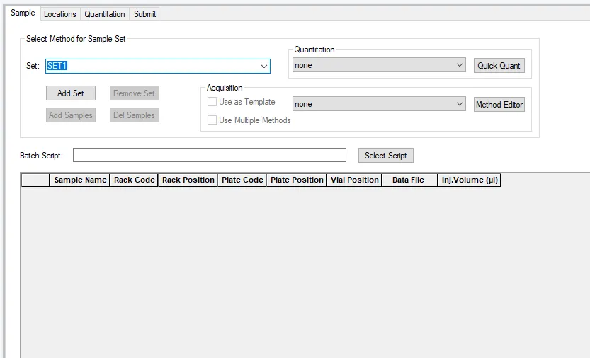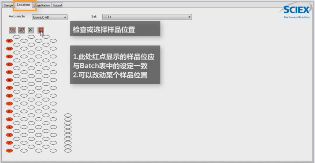 5. (可选)选择定量方法:回到 Batch Editor 对话框,在 Quantitation 选择相应的定量方法。 6. 选择采集方法:回到 Batch Editor 对话框,在 Acquisition 中选择相应的采集方法,如果同一批内需要使用多个采集方法,勾选 Use Multiple Methods。 7. (可选)在 Locations 选项卡可以查看和编辑进样瓶位置。