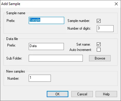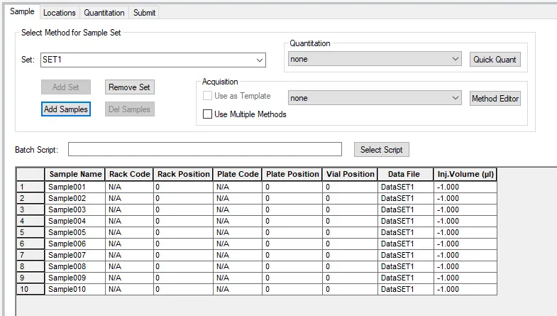 4. 添加样品: • 在导航栏中双击 Acquire -> Build Acquisition Batch,打开 Batch Editor Dialog 对话框; • 在 Set 框中输入批名(如 SET1),并点击 Add Set; • 继续点击 Add Samples,弹出 Add Sample 对话框,设置相应的样品名信息、数据文件名信息和添加的样品数量。