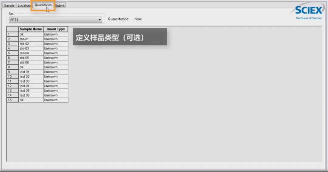 8. (可选)在 Quantitation 选项卡中可以设置样品类型,也可以等数据处理时再设置。