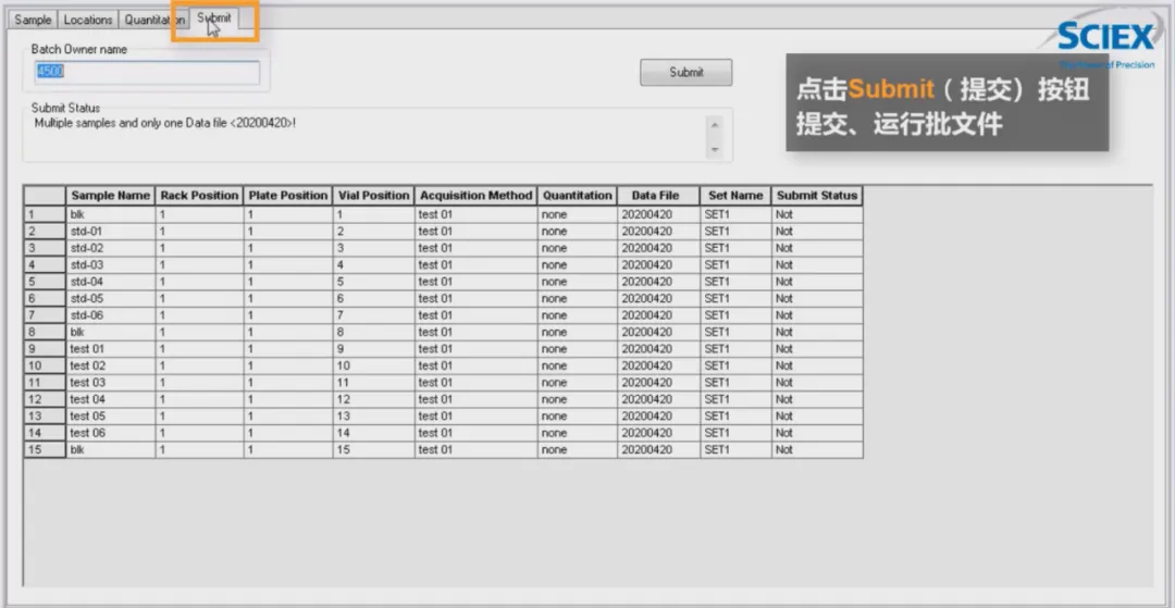 9. 提交批处理表:切换到 Submit 标签,点击提交。
