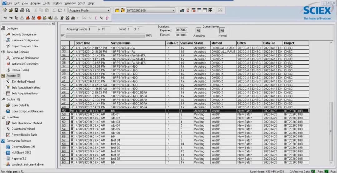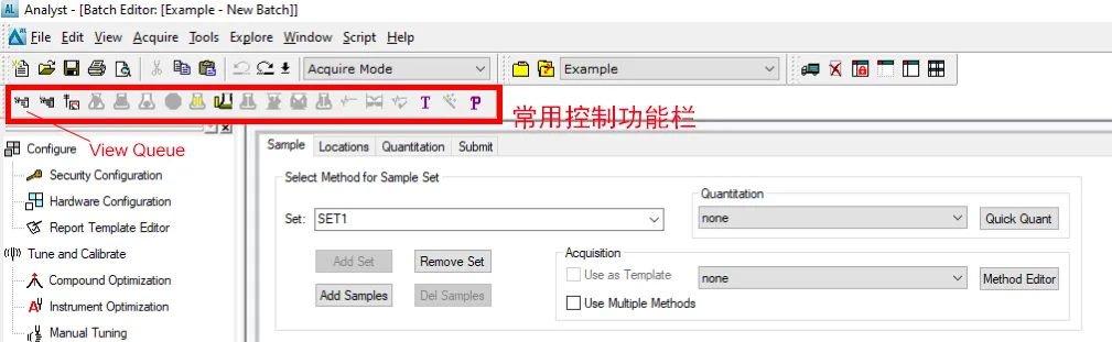 10. 提交批处理表后,软件会将批处理表中样品加入队列(Queue)中,此时还不会进样。点击 (View Queue)显示队列,可以查看提交到队列中的样品。