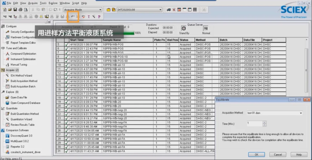• 在 Acquitation Method 中选择用于已提交批次的采集方法; • 在 Time (min) 字段中键入平衡时间,点击 OK 后开始平衡。