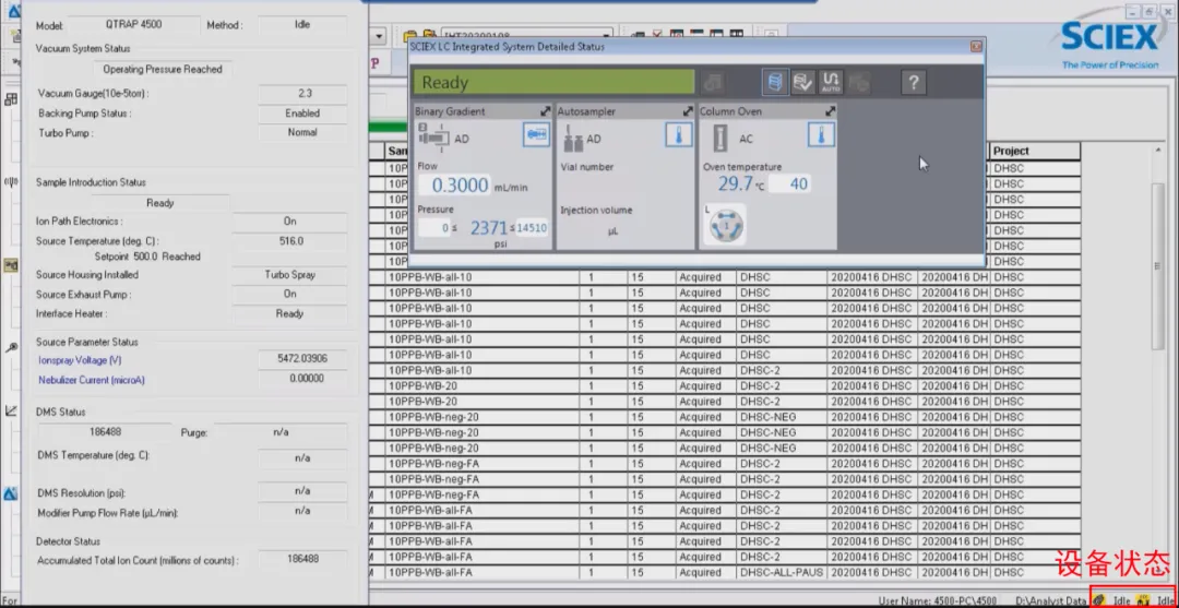 分别点击右下角的设备状态图标,可以查看液相质谱的系统状态;平衡完成后,质谱将变为 Ready 状态。